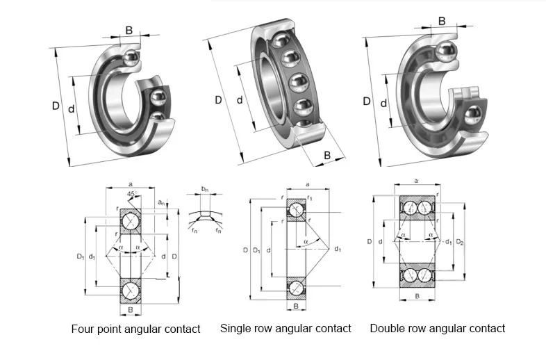 Angular contact ball bearings can withstand high radial and axial loads, while double row angular contact ball bearings can withstand large combined radial and axial loads and torque loads, mainly radial loads, limiting the axial displacement of both sides of the shaft. The tilting ability between the inner and outer rings of double row angular contact ball bearings, which are mainly used to limit the bidirectional axial displacement of the shaft and housing, is limited. The allowable tilting angle depends on the internal clearance, bearing size, internal design, and the forces and moments acting on the bearing. The allowable tilting angle should ensure that no excessive additional stress is generated inside the bearing, and generally nylon or brass solid retainers are used.